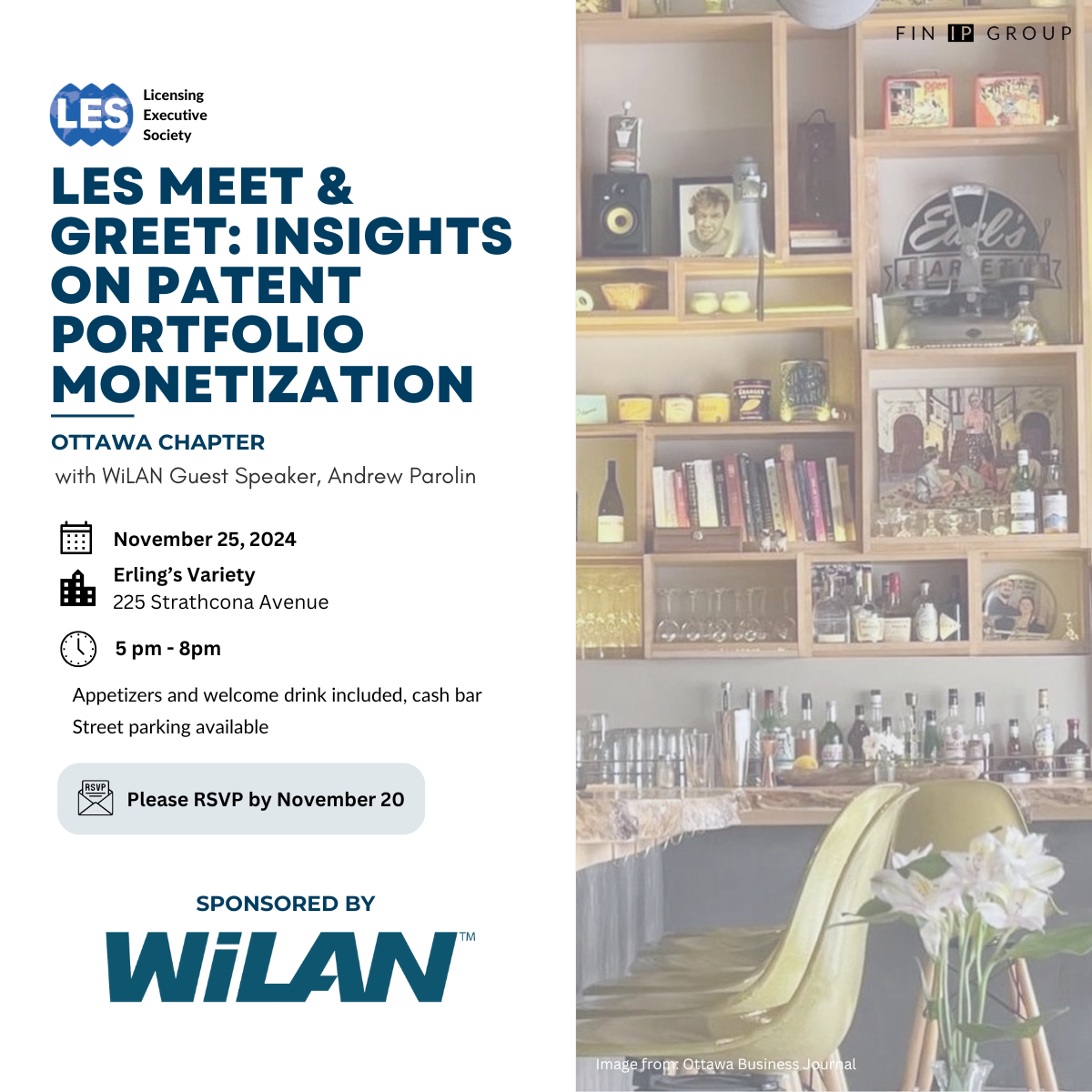 FIN IP Group is excited to be co-hosting the upcoming Licensing Executives Society (U.S.A. and Canada), Inc. Meet & Greet on November 25, sponsored by WiLAN. Join us at Erling’s Variety as WiLAN’s Andrew Parolin shares valuable insights into patent portfolio evaluation and monetization, covering common challenges and strategic approaches to maximizing IP value.